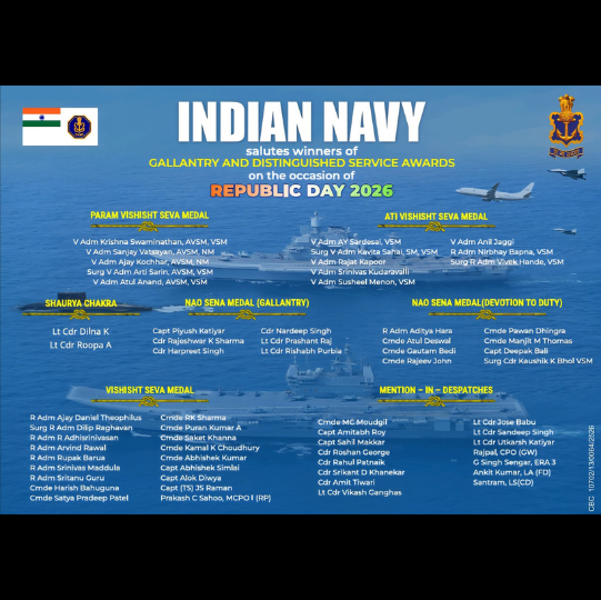 President Smt Droupadi Murmu has approved Gallantry/ Distinguished Service Awards and Mentioned-in-Despatches to the following Naval Personnel on the eve of 77th Republic Day.