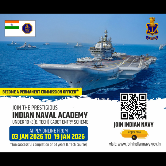 भारतीय नौसेना 10+2 बी-टेक कैडेट एंट्री स्कीम (स्थायी कमीशन) के लिए आवेदन आमंत्रित करती है। कोर्स जुलाई 2026 से शुरू होने वाले कार्यकारी और तकनीकी शाखा के लिए 44 रिक्तियां उपलब्ध हैं। विवरण के लिए www.joinindiannavy.gov.in पर जाएँ।