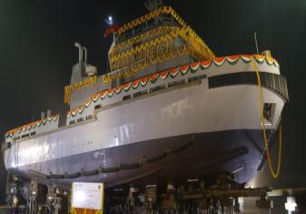 25टी. बोलार्ड पुल (बी.पी.) टग भीष्म की कमोडोर एस. श्रीकुमार, युद्धपोत उत्पादन अधीक्षक कोलकाता द्वारा लॉन्चिंग