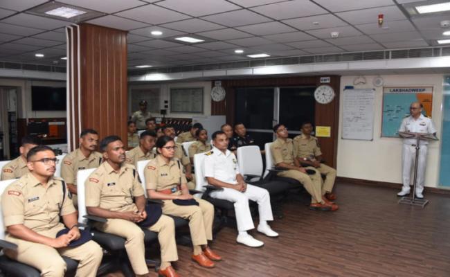 भूटान के दो विदेशी अधिकारियों सहित 22 आई.पी.एस. प्रशिक्षु अधिकारियों के एक बैच ने 22 जुलाई 2023 को दक्षिणी नौसेना कमान, कोच्चि का दौरा किया। यह दौरा एन.ओ.आई.सी. (केरल) ने आयोजित किया। प्रशिक्षु अधिकारियों को एस.पी.बी. (कोच्चि), तटीय रक्षा मुख्यालय (सी.डी.एच.क्यू.) और संयुक्त ऑपरेशंस केंद्र (कोच्चि) के दौरे पर ले जाया गया। प्रशिक्षुओं को फास्ट इंटरसेप्टर क्राफ्ट एफ.आई.सी. की भूमिका पर प्रकाश डालते हुए तटीय सुरक्षा संगठन, अंतर एजेंसी समन्वय और निगरानी सह चौकसी तंत्र का एक संक्षिप्त अवलोकन प्रदान किया गया। इस पारस्परिक संवाद ने अधिकारियों को सभी तटीय सुरक्षा हितधारकों के बीच एकजुटता के माध्यम से निर्बाध तटीय सुरक्षा सुनिश्चित करने की दिशा में भारतीय नौसेना की जिम्मेदारियों और प्रयासों को समझने में मदद की।