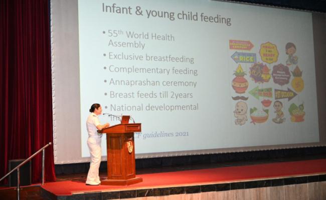 मॉनसून श्रृंखला के व्याख्यानों के हिस्से के रूप में, आई.एन.एच.एस. अस्विनी ने 18 सितंबर 2023 को 'बच्चों में पोषण' पर एक व्याख्यान दिया। कार्यक्रम में पश्चिमी नौसेना कमान के सी.एम.ओ., सर्जन रियर एडमिरल अनुपम कपूर मुख्य अतिथि थे। आई.एन.एच.एस. अस्विनी के एक स्त्री रोग विशेषज्ञ, बाल रोग विशेषज्ञ और आहार विशेषज्ञ ने प्रसव पूर्व अवधि में अच्छे पोषण, स्तनपान और पूरे बचपन में अच्छी भोजन आदतों के महत्व पर जोर देते हुए गर्भावस्था, शिशुओं, बच्चों और किशोरों में पोषण के बारे में बात की। सेवा कर्मियों और उनके परिवारों ने बातचीत से लाभ उठाया और क्यू. और ए. सत्र के दौरान सक्रिय रूप से भाग लिया।