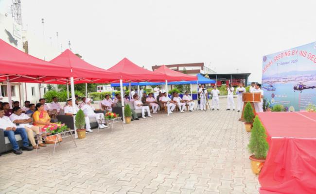 जी.वी.एम.सी. और पूर्वी नौसेना कमान की संयुक्त पहल के तहत 2 अक्टूबर, 2023 को भा.नौ.पो. डेगा से बीजबॉल के हवाई फैलाव को हरी झंडी दिखाई गई। बीजबॉल से लदे नौसेना के हेलीकॉप्टरों को भा.नौ.पो. डेगा के कमांडिंग ऑफिसर कमोडोर दलीप सिंह और श्री. श्रीनिवास, अतिरिक्त आयुक्त जी.वी.एम.सी. की उपस्थिति में विशाखापट्टनम की महापौर श्रीमती जी. हरि वेंकट कुमारी और रियर एडमिरल मनीष शर्मा, सी.एस.ओ. (ओ.पी.एस.), पूर्वी नौसेना कमान ने संयुक्त रूप से हरी झंडी दिखाई। विशाखापट्टनम के विभिन्न स्थानों पर हवाई सीडिंग की गई, जिसमें पावरुलाकोंडा, कपूलुप्पडा, सिम्हाचलम, पोरलुपलेम हिल, वेदुल्लानरावा हिल और यरडा शामिल थे। अभियान के पर्यावरणीय प्रभाव को अधिकतम करने के लिए इन स्थानों को सावधानीपूर्वक चुना गया। इस महान प्रयास को पूरा करने के लिए, चार हेलीकॉप्टरों का एक बेड़ा तैनात किया गया था। भा.नौ.पो. डेगा में हेलीकॉप्टरों को झंडी दिखाकर बीजबॉल फैलाव अभियान शुरू किया गया, जिसके दौरान 1.5 लाख बीजबॉल छितराई गईं। यह संयुक्त अभियान विशाखापट्टनम और उसके आसपास हरित क्षेत्र को बढ़ाने के लिए सामूहिक प्रतिबद्धता को दर्शाता है।
