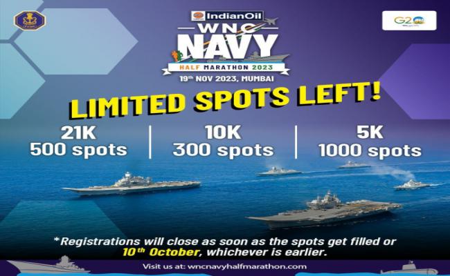 इंडियन ऑयल डब्ल्यू.एन.सी. नेवी हाफ मैराथन का छठा संस्करण 19 नवंबर 2023 को मुंबई में निर्धारित किया गया है। जाइए अपना पदक प्राप्त कीजिए! अपने दोस्तों को बताएं जो इस चकाचौंध को पाना चाहते हैं! 10 अक्टूबर 2023 को पंजीकरण बंद हो जाएंगे। रजिस्टर करने के लिए - https://wncnavyhalfmarathon.com पर लॉग ऑन करें।
