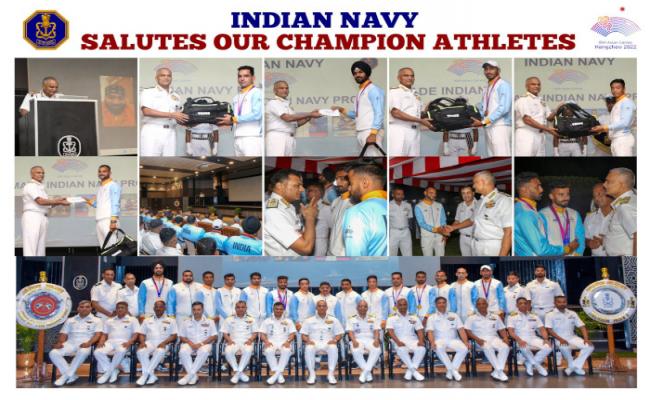 19वें एशियाई खेलों में तीन स्वर्ण, दो रजत और एक कांस्य पदक जीतने वाले भारतीय नौसेना के एथलीटों की ऐतिहासिक उपलब्धि को देखते हुए एडमिरल आर. हरि कुमार, सी.एन.एस. ने नई दिल्ली में नौसेना के खिलाड़ियों को सम्मानित किया। भारतीय खेलों के इतिहास में मील के पत्थर का हिस्सा बनने पर नौसेना के एथलीटों को बधाई देते हुए, सी.एन.एस. ने राष्ट्र और नौसेना को महिमा दिलाने की दिशा में उनकी अटूट भावना और प्रतिबद्धता की सराहना की और उन्हें उत्कृष्टता के लिए प्रयास करते रहने और मिशन ओलंपिक में विजयी होने के लिए प्रेरित किया।