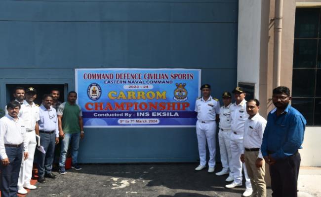 रक्षा असैनिक खेल चैम्पियनशिप 2023-24 कैरम चैम्पियनशिप के लिए मुख्यालय पूर्वी नौसेना कमान की छत्रछाया में 05 से 07 मार्च 2024 तक भा.नौ.पो. एक्सिला द्वारा आयोजित की गई। महिला और पुरुष श्रेणियों में विजेताओं को समापन समारोह के दौरान सम्मानित किया गया। पूर्वी नौसेना कमान l