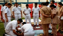 A two day Simulation Based Training Workshop for Nursing Officers and Medical Assistants of Southern Naval Command titled ‘Simulation in Resuscitation’ was organised from 27 to 28 November 2018 at School of Medical Assistants (SOMA), Mumbai. The objective of the workshop was to enhance the knowledge and skills of participants in Cardiac and Trauma resuscitation, as per extant guidelines of Basic Life Support, Advanced Cardiac Life Support and Advanced Trauma Life Support. The workshop was conducted by instructors from SOMA along with medical staff of INHS Asvini. The delegates underwent rigorous hands-on sessions on the High Fidelity Simulation Mannequin (Sim-Man 3G) to hone their skills on Airway and Difficult airway management, Needle Cricothyroidotomy and Intra-Venous and Intra-Osseous cannulation. The delegates were also trained on Medium and Low Fidelity Simulation Mannequins (Nursing Anne and Megacode) with simulation of various nursing procedures and Megacode exercises.