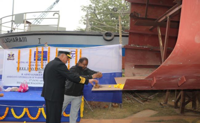 Keel laying for fourth Diving Support Craft DSC A23 (Y-328) project was held on 17 January 2023 at Titagarh Wagons Ltd, Kolkata. Rear Admiral Sandeep Mehta, ACWP&A presided over ceremony. The ships are scheduled to be inducted into Indian Navy commencing end 2023 onwards to provide diving assistance for ships close to harbour, for underwater repairs, maintenance and salvage. The ships will be fitted with state of the art diving equipment and tools for performing various operations. Further, main and auxiliary equipment are being sourced from Indigenous manufacturers.