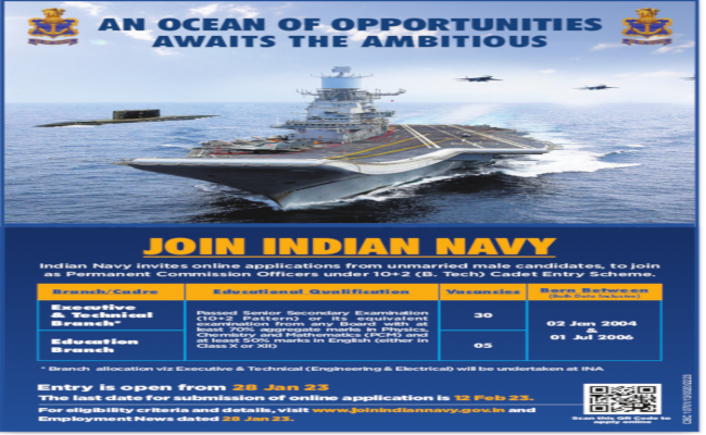 Online applications are invited from unmarried male candidates (fulfilling the conditions of nationality as laid down by GoI) to join prestigious four years B. Tech degree course under the 10+2 (B.Tech) Cadet Entry Scheme at INA Ezhimala, Kerala. The entry will be open from 28 January 2023. The last date for submission of online application is 12 February 2023. For eligibility criteria and other details, visit www.joinindiannavy.gov.in and Employment News dated 28 January 2023.