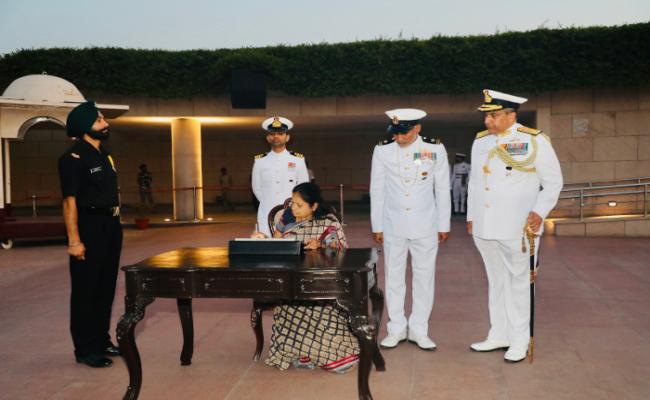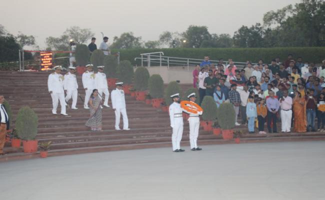 Family members of Late Mahavir Singh, PO CD-I comprising Mrs Jyoti Verma (wife) paid homage at National War Memorial on 01 March 2023. Flower petals were placed at 'Tablet' and laid a wreath at memorial. Late Mahavir Singh, PO CD-I as a member of MARCOs team deployed for Op Rakshak in Bandipore, J&K. On 12 August 1999, his team was tasked by team commander to carryout Area Domination Patrol. During operation, militant succeeded in detonating a landmine, thus halting the advance. The sailor was tasked to defuse the balance landmines. He along with his commander, commenced a low belly crawl towards the rest of landmines and defused two landmines. He, thereafter came under heavy fire from militants. Displaying excellent field craft and fire power both MARCOs returned fire. On approach to last landmine, the militants remotely donated landmine, thereby instantly killing both M Singh PO CD-I and team commander. Late Mahavir Singh, PO CD-I displayed exceptional courage and made supreme sacrifice for nation.