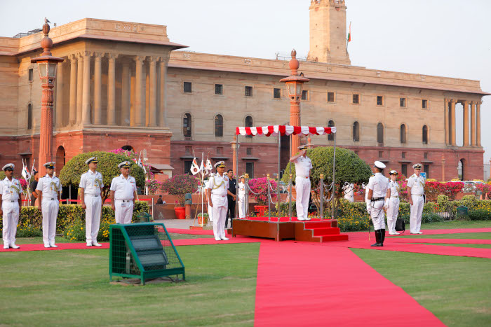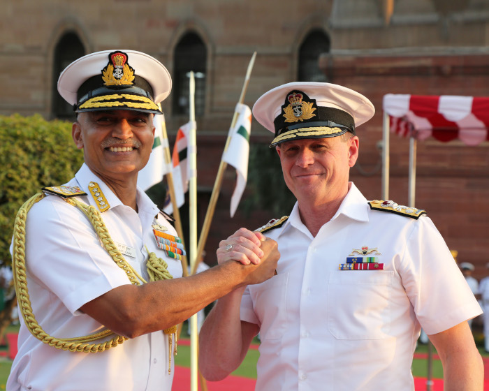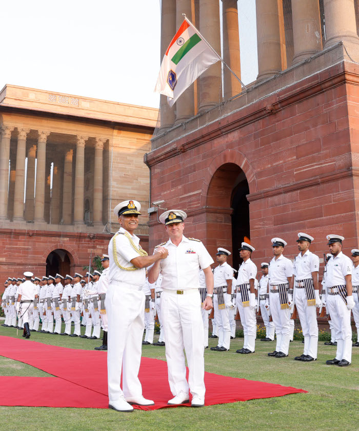 VAdm Mark Hammond, Chief of Navy, Royal Australian Navy (CN) is on a three-day official visit to India from 09 – 11 March 2023. During the visit, VAdm Mark Hammond interacted with Adm R Hari Kumar, Chief of the Naval Staff, at New Delhi on 10 March 2023. He was welcomed with an impressive Guard of Honour on the South Block Lawns.