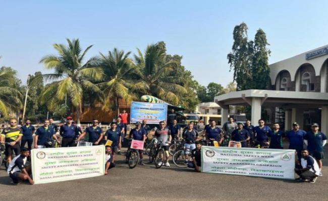 As part of National Safety Week Celebrations, a group of officers from ND, Visakhapatnam, led by Rear Admiral Sanjay Sadhu, ASD, embarked on a Cyclathon to spread awareness about Road Safety. The group rode from NCB to INS Kalinga displaying posters on Road Safety as well as importance of Safety at workplace and at home. The event culminated the week long programmes organised by establishment on Safety with theme 'Our Aim Zero Harm'.