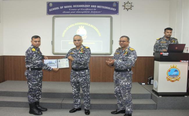 A batch of four Indian Navy officers successfully completed Advanced Oceanography Course on 24 March 2023. Commodoe SM Urooj Athar, Director, NODPAC was the Chief Guest for the valedictory function and awarded trophies and certificates to the passing out officers. The 24 weeks Course was covered in two phases. Phase one of the course was conducted at INCOIS, Hyderabad, wherein training on theoretical and operational aspects of Oceanography was conducted by eminent scientists. Phase two of the course was conducted at SNOM, Kochi. During this phase, practical orientation in the field of Oceanography and training visits to scientific oceanographic organisations and attachments to various Naval training schools were undertaken. Additionally, the trainee officers were also exposed to handling of large oceanographic datasets, remote sensing and scientific analysis.