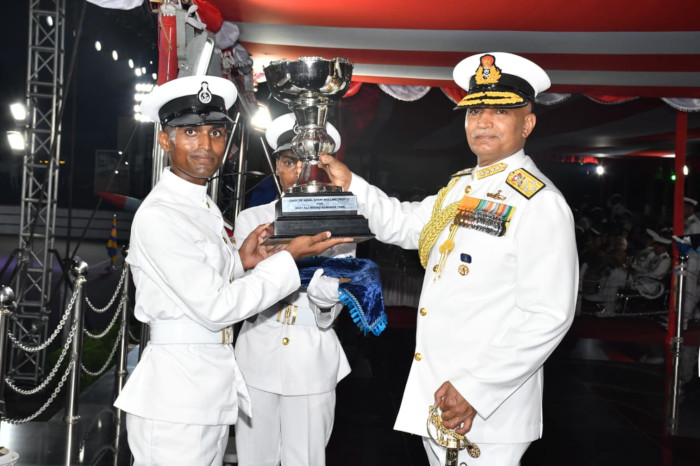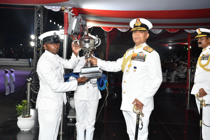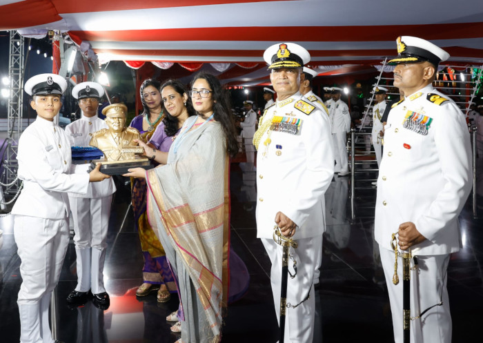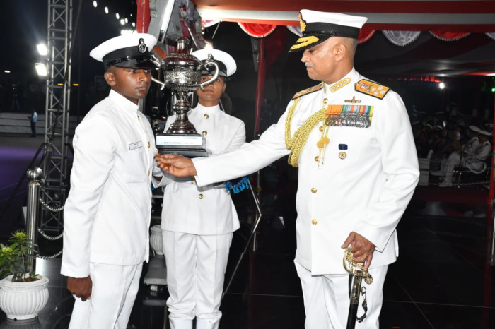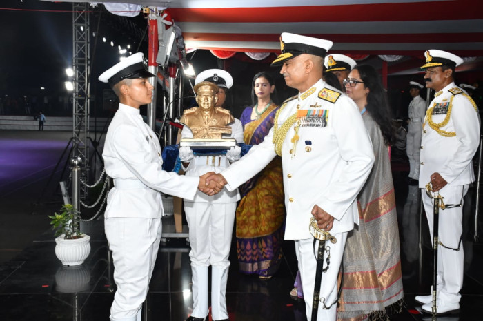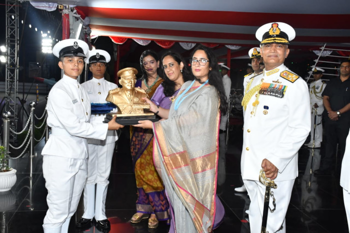 The Chief Guest also awarded medals and trophies to the meritorious Agniveers on the occasion. Amalakanti Jayaram, Agniveer (SSR), Ajith P, Agniveer (MR) were awarded Chief of the Naval Staff Rolling Trophy and Gold Medal for Best Agniveer SSR and MR respectively in men's category. Khushi, Agniveer (SSR) was the Best Woman Agniveer in the overall order of merit. A Rolling Trophy, instituted to commemorate the vision of Late General Bipin Rawat - the first CDS was awarded to her by the daughters of Late Gen Bipin Rawat.