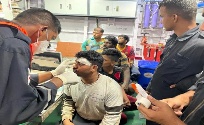 INS Baratang, while on a routine patrol in Palk Bay, received a distress call from an Indian origin fishing boat MM MFB 'Matha', around 11 PM on 04 April 2023. The ship immediately reached to the position. Communication with the boat was established and on enquiry it was revealed that five fishermen among crew of 12 were injured. The injured crew members were brought onboard using ship's boat and were provided medical assistance and first aid. Post treatment, injured crew members were sent back to their boat.