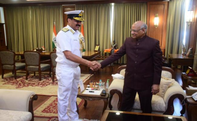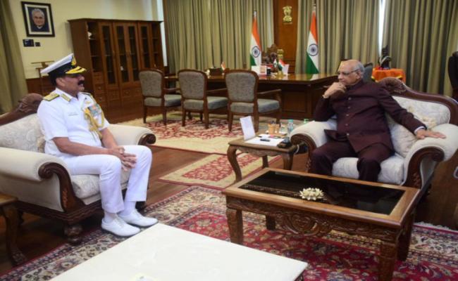 Vice Admiral Dinesh K Tripathi, FOCINC WNC, called-on Shri Ramesh Bais, Hon'ble Governor of Maharashtra at Raj Bhavan on 09 April 2023. CINC briefed Governor on various operations being undertaken by WNC to enhance overall maritime security on western seaboard.
