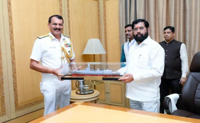 Vice Admiral Dinesh K Tripathi, FOCINC WNC called-on Shri Eknath Shinde, Hon'ble CM of Maharashtra at Sahyadri Guest House on 17 April 2023. CINC briefed CM on efforts and initiatives by Indian Navy to address challenges related to maritime security on Western Seaboard, including ongoing initiatives for Coastal Security of the state of Maharashtra.