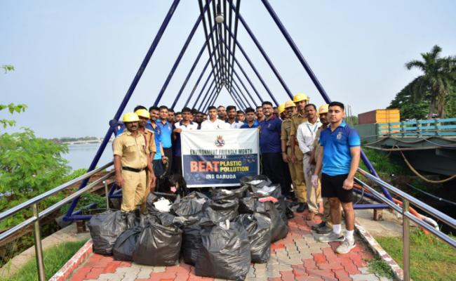 Environment friendly month is being conducted at SNC from May - Jun 2023 in various parts of Kochi city under the theme 'Beat Plastic Pollution'. As part of environmental awareness drive, Naval personnel and families of INS Garuda and other units of SNC along with personnel from Cochin Port Trust Authority conducted a cleanship drive at Cochin Port Trust Avenue Walkway on 14 May 2023. The event evoked enthusiastic participation from local populace who joined cleanship campaign. The area was cleared of plastic and non biodegradable waste and handed over to municipal authorities.