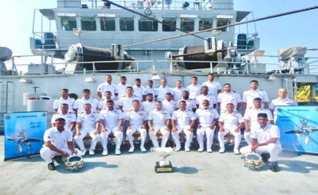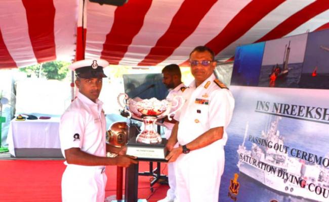 Passing out ceremony of Saturation Diving course was conducted onboard INS Nireekshak on 22 May 2023. 11 trainees successfully completed ten week intensive course in which trainees underwent gas mixture theory, harbour lockouts, system watch keeping training and qualification dive. RAdm Upal Kundu, CSO(Training), SNC was the chief guest for ceremony. Tamil Kumaran S, Sea I Clearance Diver was adjudged Best Trainee and was awarded INS Nireekshak Rolling Trophy.