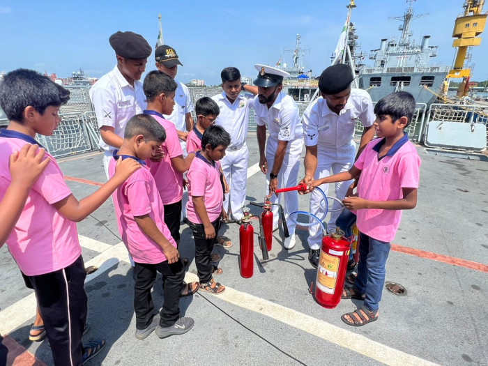 As part of outreach programme of SNC, 23 differently abled students from School for Blind, Aluva visited INS Sujata. Students along with staff were taken on a guided tour onboard and familarised with basic features of a warship. They were acquainted with small arms and portable fire fighting equipment onboard. The visit for students was a special moment being for the first time and a life long experience too.