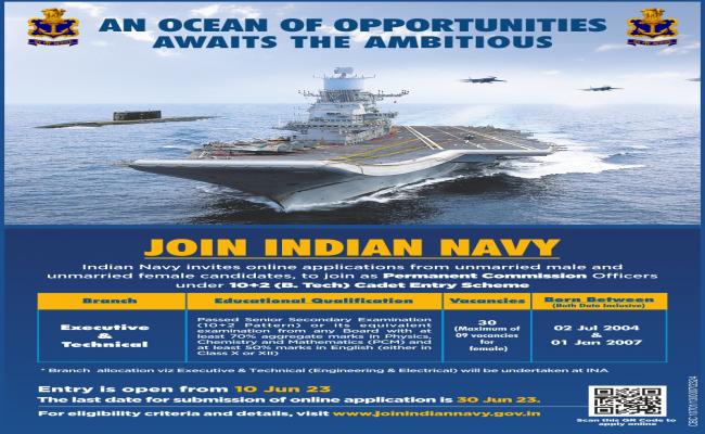 Online applications are invited from unmarried male and unmarried female candidates (fulfilling condition of nationality as laid down by Govt. of India) to join prestigious INA, Ezhimala, Kerala for a four year B.Tech degree course under 10+2 (B.Tech) Cadet Entry Scheme for Executive and Technical branch. The entry will be open from 10 Jun 2023. The last date for submission of online application is 30 Jun 2023. For eligibility criteria and other details, visit www.joinindiannavy.gov.in .