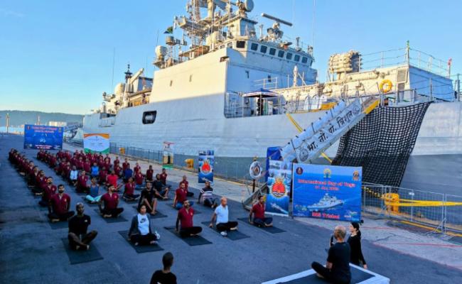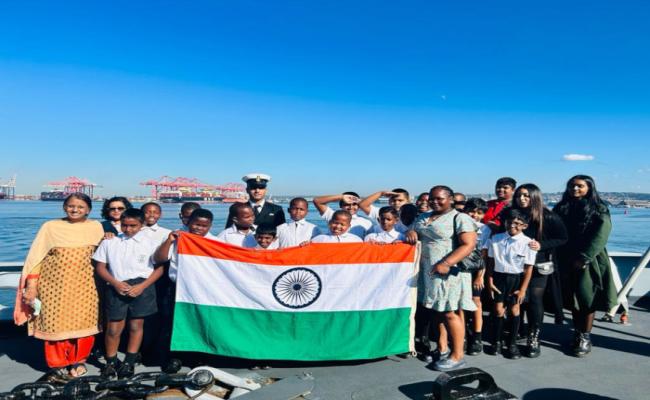 On day 4 of ship’s visit to Durban, personnel from INS Trishul alongwith officials of CGI Durban and a team from South African Armed forces participated in a yoga session, in run upto to International Day of Yoga 23 themed Ocean Ring of Yoga and Yoga from Arctic to Antarctica. Later in day, Indian Navy personnel visited Durban Naval base and were briefed on responsibilities of South African Navy. The team was given a tour of Base and a demonstration of operational diving capabilities. A cross visit of SAN personnel was undertaken, wherein visitors were given a tour of ship and a demo of VBSS, which was followed by professional interactions. Indigenous firefighting equipment and damage control gears were demonstrated during visit. The ship was open for visitors and welcomed guests from CGI staff, school and university students and members of Ethekwini municipality. The day concluded with a friendly volleyball match between Ship’s and SAN teams. In an unprecedented show of generosity and gratitude, team Trishul received a token of love in form of home-grown fruits and vegetables from residents affiliated with Child and Family Welfare Society of Durban, where Ship’s Team had undertaken an outreach on 08 June 2023.