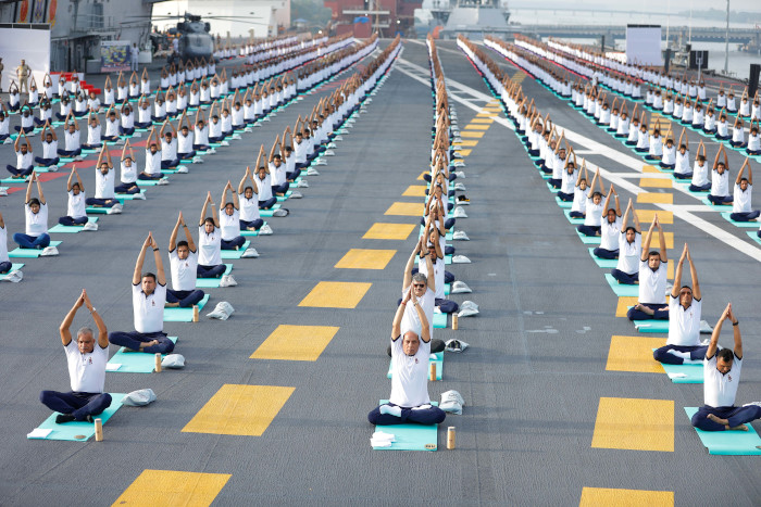 On 21 Jun 2023, the Hon'ble Raksha Mantri joined the Indian Navy personnel onboard the indigenous aircraft carrier, INS Vikrant, for the International Day of Yoga celebrations. Over 800 Armed Force personnel along with their families, came together to join the event embracing the spirit of unity and well-being. Expert yoga instructors guided the participants through various yoga asanas (poses) and breathing exercises promoting physical fitness, mental calmness and spiritual healing.  On completion, the Raksha Mantri felicitated the yoga instructors and interacted with the participants including the Indian Navy Agniveers who are undergoing their professional courses at the Southern Naval Command.