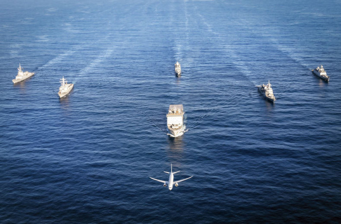 The Indian Navy was represented by indigenously built Destroyer INS Kolkata, Frigate INS Sahyadri and P8I Maritime Patrol Aircraft. Other participating units included RAN ships HMAS Choules and HMAS Brisbane, USS Raphael Peralta, JS Shiranui, along with submarines, fighter aircraft, maritime patrol aircraft and shipborne helicopters.