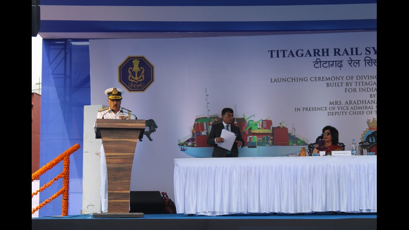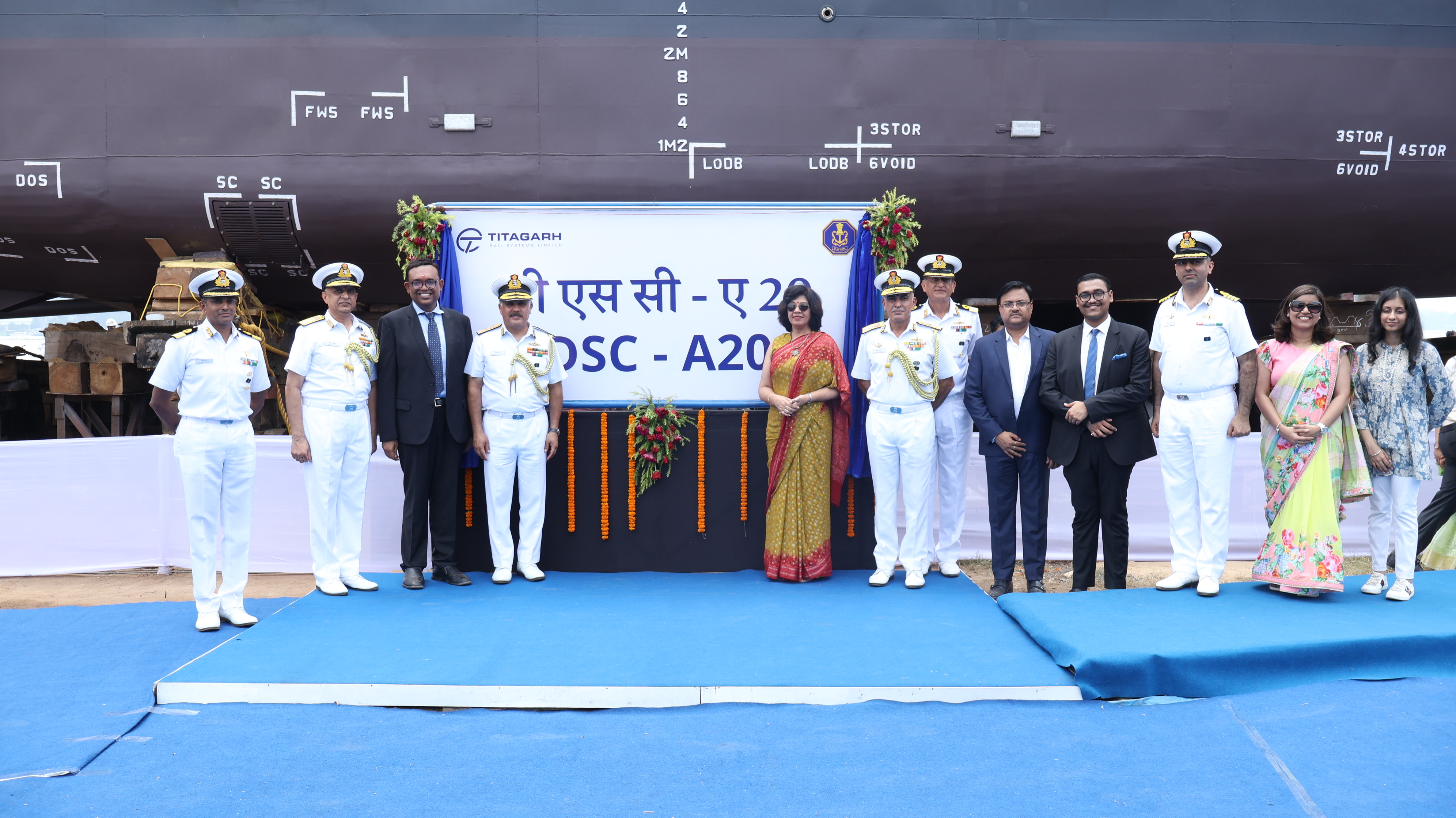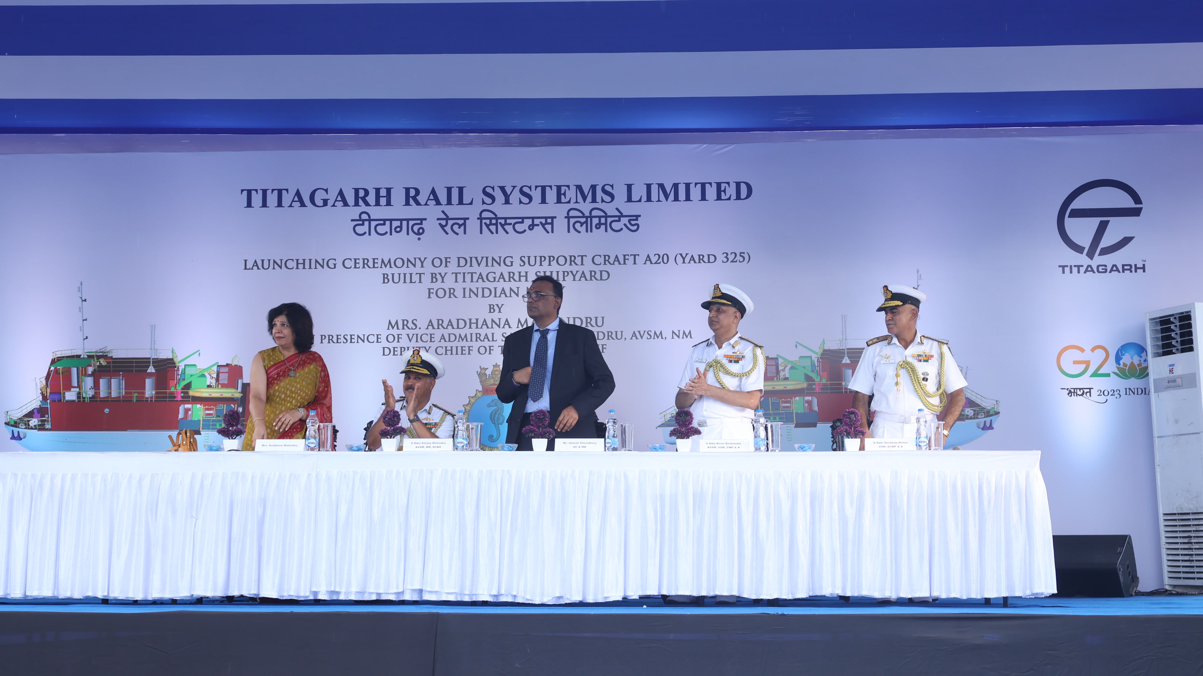 ‘DSC A 20’ (Yard 325), the first ship of Five (05) Diving Support Craft (DSC) project being built by M/s Titagarh Rail Systems Ltd (TRSL), Kolkata (formerly known as M/s Titagarh Wagons Ltd (TWL)) for Indian Navy, was launched on 31 Aug 23 at Titagarh, Kolkata (WB) onto Hooghly River. The Launch Ceremony was presided over by VAdm Sanjay Mahindru, Deputy Chief of Naval Staff (DCNS). In keeping with Naval tradition, Mrs Aradhana Mahindru launched the ship with invocation from Atharva Veda