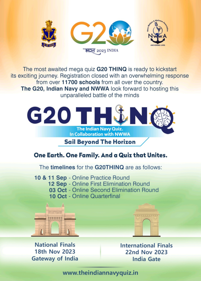 To commemorate Azadi ka Amrit Mahotsav, Indian Navy had scaled up the Inter School Quiz competitions held at various stations to a National Level School Quiz Competition – The Indian Navy Quiz (THINQ). This year on India assuming Presidency of the prestigious G20, THINQ has become an international event and rechristened “G20 THINQ”. The event is being conducted by the Navy under the aegis of the G20 Secretariat and in partnership with NWWA (Navy Welfare and Wellness Association) and will have two levels National and International.