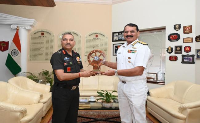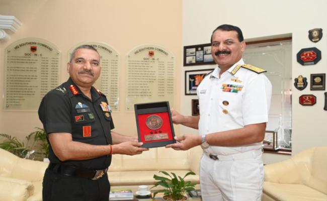 VAdm Dinesh K Tripathi, FOCINC WNC during his visit to Pune, interacted with Lt Gen Ajai Kumar Singh, GOCINC, Southern Command on 24 Aug 2023 and discussed the current security scenario and issues related to jointness and Integration towards achieving greater synergy in operations.