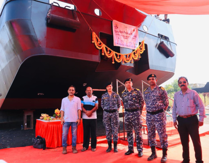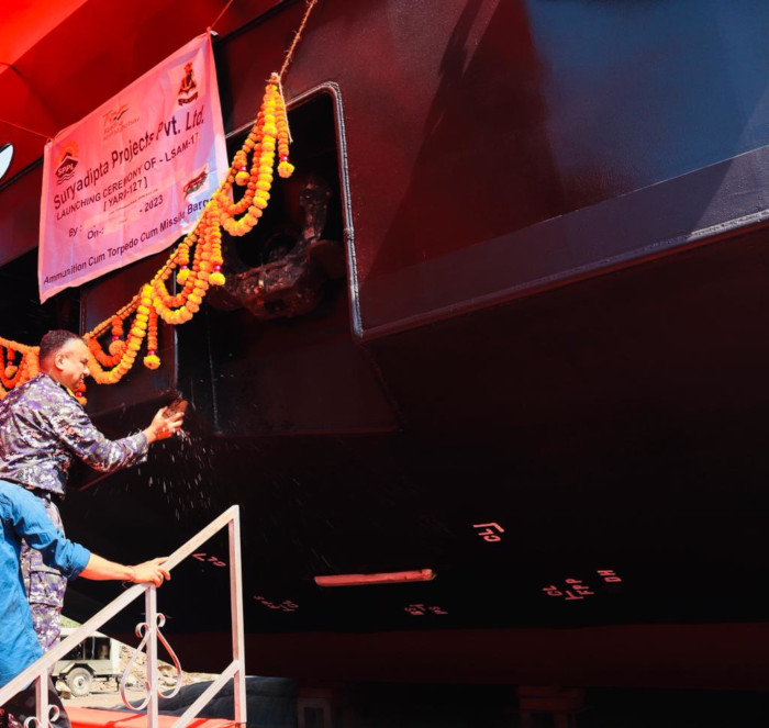 Third Ammunition Cum Torpedo Cum Missile (ACTCM) Barge, LSAM 17 (Yard 127) was launched by Cmde V Pravin, AWPS (Mbi) on 27 Oct 2023 at M/s Suryadipta Projects Pvt Ltd, Thane. With all major and auxiliary equipment/systems sourced from indigenous manufacturers, this Barge is proud flag bearer of “Make in India” initiative of Ministry of Defence.