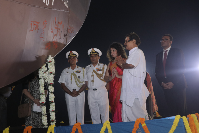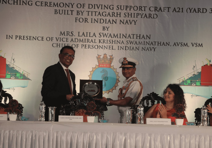 The launch of ‘DSC A 21’, the second ship of 05 x Diving Support Craft (DSC) project, being built by M/s Titagarh Rail Systems Ltd (TRSL), Kolkata for Indian Navy, was undertaken on 30 Oct 2023 at Titagarh, Kolkata (WB) onto Hooghly River. The Launch Ceremony was presided over by VAdm K Swaminathan, Chief of Personnel. In keeping with the Naval maritime tradition, Mrs Laila Swaminathan launched the ship.
