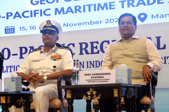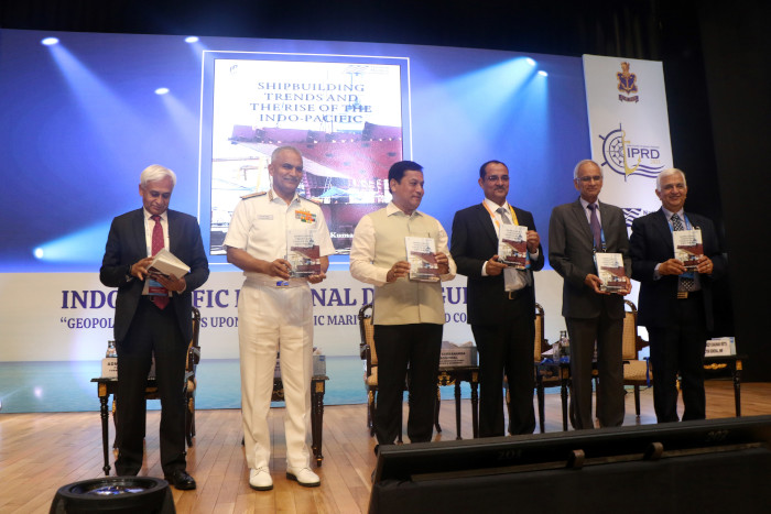 The Hon’ble Minister Shri Sarbananda Sonowal, acknowledged the sterling role of the Indian Navy and the National Maritime Foundation in furthering maritime thought in India, especially among the population, through initiatives such as the IPRD. He stated the India’s vision to grow to an eight trillion US dollar economy by 2030, and to 30 trillion USD economy by 2047 would be facilitated in large measure through the growth in her maritime sector. He brought out that the acronym SAGAR (Security and Growth for all in the Region) clearly encapsulated India’s maritime policy and elaborated upon various initiatives of the Ministry of Ports, Shipping and Waterways in its support. He stressed the need to build resilience of port infrastructure and the maritime sector not only against sea level rise, but also against climate change as a whole. He specifically alluded to the Harit Sagar (Green Ocean) initiative of the Government which envisages several new projects related to green hydrogen, green port guidelines, renewable energy and biodiversity protection. The Hon’ble Minister also brought out the connectivity initiatives such as SAGARMALA, inland waterways, the recently announced India-Middle East-Europe Economic Corridor (IMEC), International North South Transport Corridor (INSTC) and the Eastern maritime (Chennai-Vladivostok) corridor. The minister also spoke about the government’s vision to make India a premier ship cruise hub in the region. In conclusion, the minister commended the efforts of the Indian Navy and the NMF in promoting and preserving India’s maritime interests. On completion of his address, the Hon’ble Minister released a book entitled “Shipbuilding Trends and the Rise of Indo-Pacific”, published by the NMF.