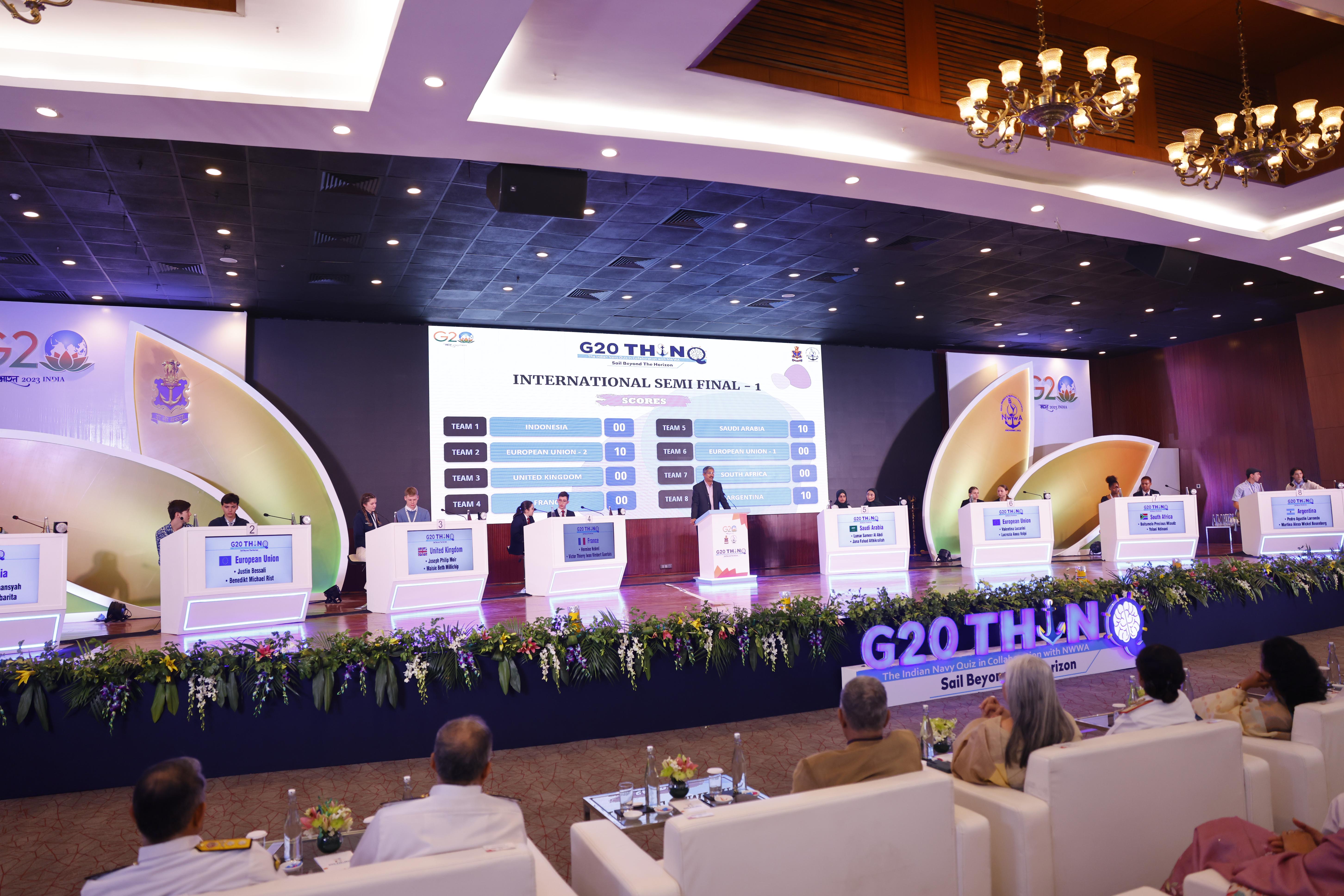 National Round. The National Round of the G20 ThINQ saw participation of 11741 schools where students in IX to XII/ equivalent matched their wits over two online elimination rounds, an online quarter-final and a tie breaker leading to the identification of 16 semifinalists who converged at Mumbai for the national semifinals and finals, which were held at the NCPA auditorium and Gateway of India respectively on 17-18 Nov 23. The competition was intense and emergent winner of the National Round, DAV Public School Gurugram, was chosen as Team Bharat to represent India in the International round.