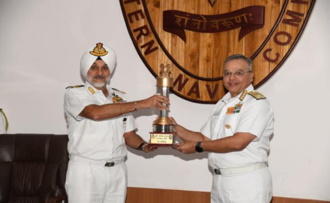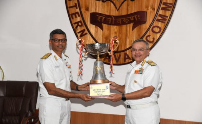 Vice Admiral Rajesh Pendharkar FOCINC ENC presented Eastern Naval Command Rajbhasha Trophy for the year 2022-23 to Naval Dockyard, Visakhapatnam as Winners and INS Dega as Runners-up during the Half Yearly Command Staff Meeting held on 21 Nov 2023. These Trophies are awarded to units for undertaking maximum official work in Hindi.
