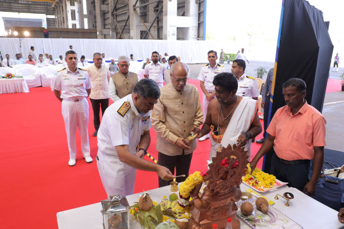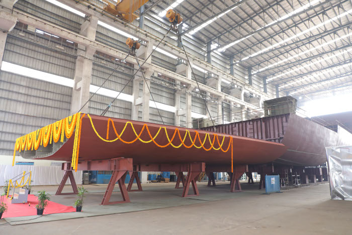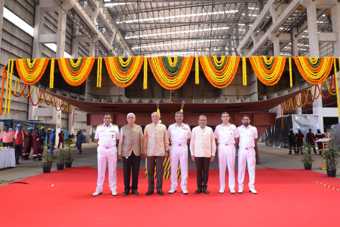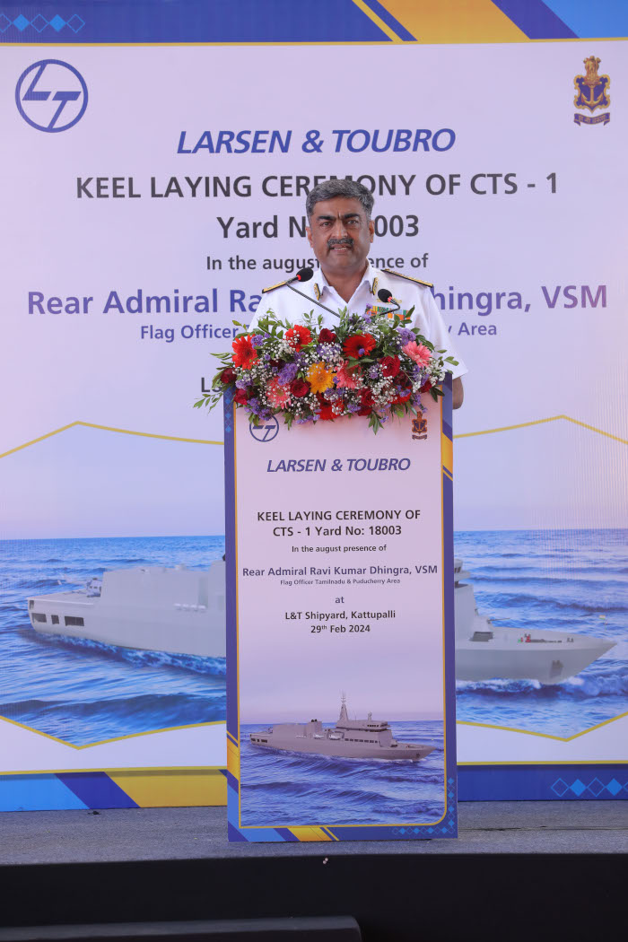 Keel Laying Ceremony of the first Cadet Training Ship (Yard-18003) was held at M/s L&T Shipyard, Kattupalli, on 29 Feb 24. The ceremony was presided by R Adm Ravi Kumar Dhingra, Flag Officer Tamil Nadu and Puducherry Area in presence of R Adm G K Harish, AVSM, VSM (Retd), Head Shipbuilding Business, L&T and other Senior officials from Indian Navy and M/s L&T.